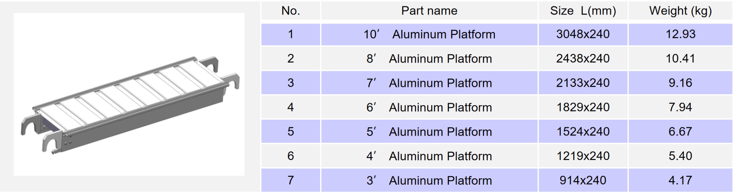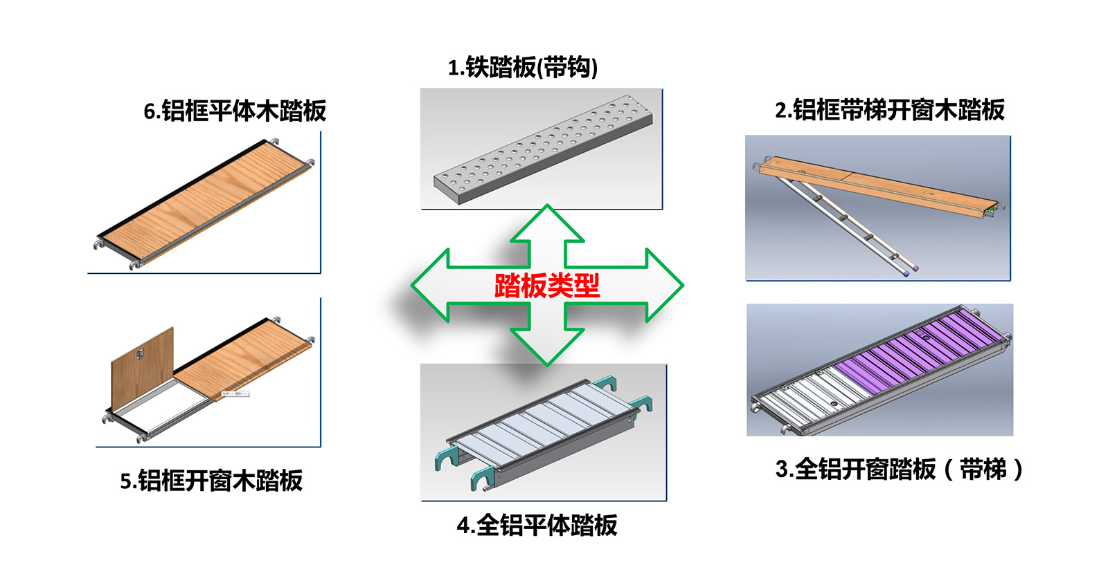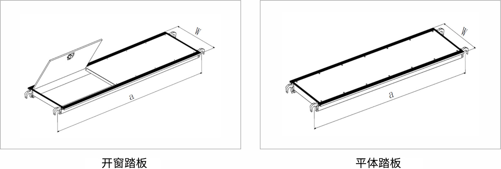 裝配在水平桿上,作為施工或承托物品的工作平臺。采用鋁框+ 木防滑膠合板制作,且自帶防風、開窗功能。 踏板寬度有300和600兩種,長度600~3000,每個300一種規格。 |