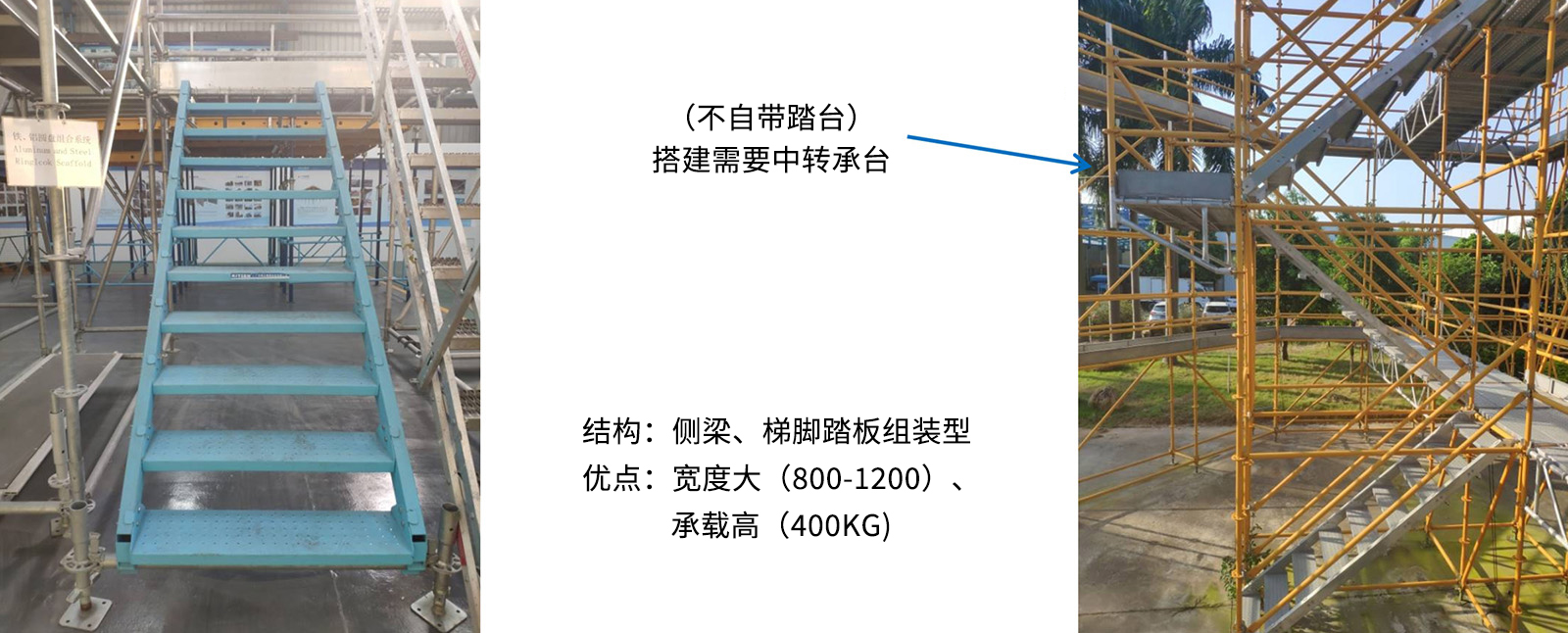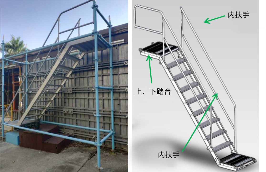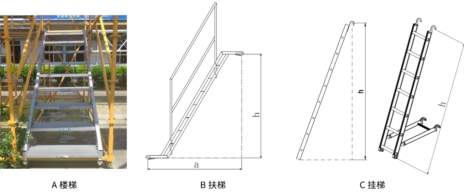 結構:梯踏臺,梯腳踏板、側梁組合焊接型;+內、外扶手組成。 優點:跨度度400-800、承載高、安裝快速。 |