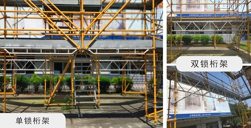 由上下弦桿焊接組成的與立桿扣件的水平加強桿件,用于腳手架跨空位置。 作用:(施工)人行、車通道、飛機、輪船、設備維修等等。 |