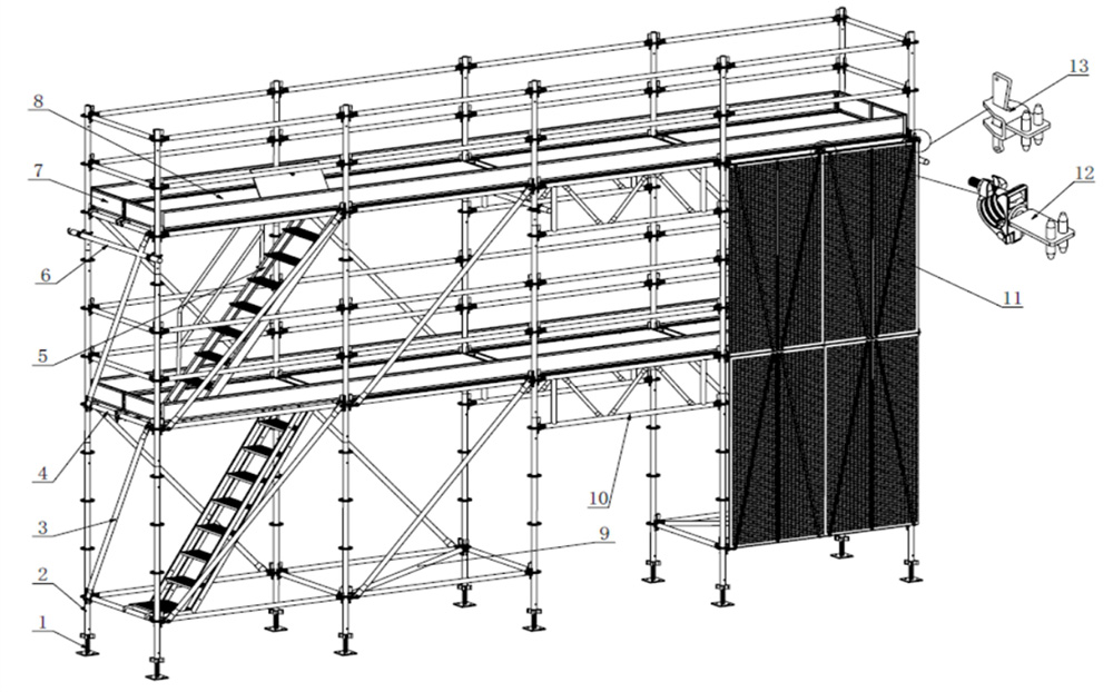 1---可調底座; 2---立桿; 3---豎向斜桿; 4---水平桿(橫桿); 5---上落梯; 6---連墻件; 7---踢腳板; 8---工作平臺(踏板); 9---水平斜桿; 10---水平桁架; 11---防護網; 12---防護網水平桿連接件; 13---防護網立桿連接件。 |