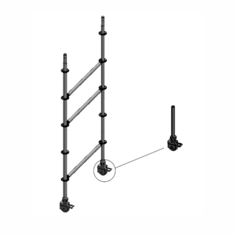 | 1. 腳手架塔須由至少2名工作人員操作。有關適當培訓的詳細信息,請與您的供應商聯系。應用制動器,并將可調整的腳輪安裝到立柱管內。 | 2. 將2個水平橫桿安裝在立柱的連接盤內。參見放大視圖。 |