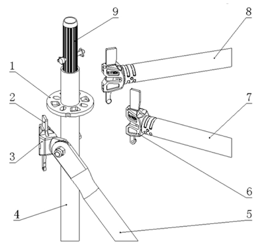 說明: 1---連接盤; 2---扣接頭插銷; 3---斜桿桿端扣接頭; 4---立桿; 5---豎向斜桿; 6---水平桿桿端扣接頭; 7---水平桿(橫桿); 8---水平斜桿; 9---連接套管。 |