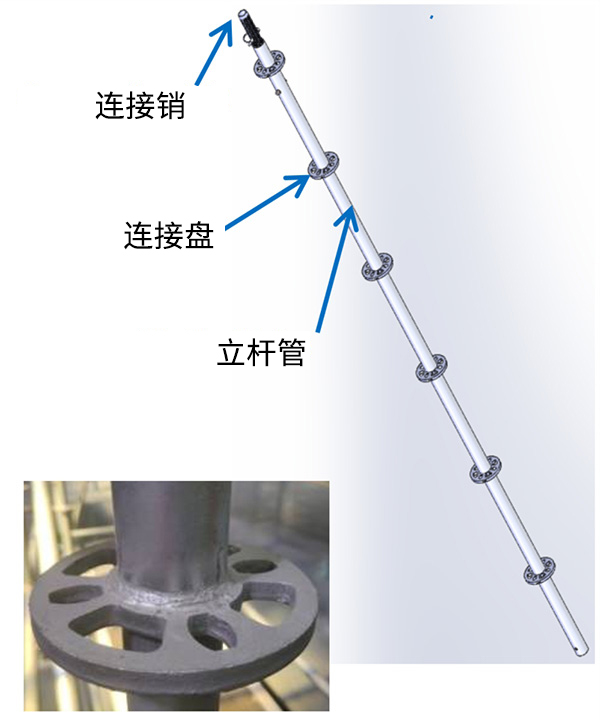 ② 管體每隔500MM設置焊接8孔連接盤;各桿件軸心交于一點。架體受力以軸心受壓為主,由于有斜拉桿的連接,使得架體的每個單元近似于格構柱,因而承載力高,不易發生失穩。 ③ 連接銷固定于立桿一端,用于立桿豎向接長的內插管。 |