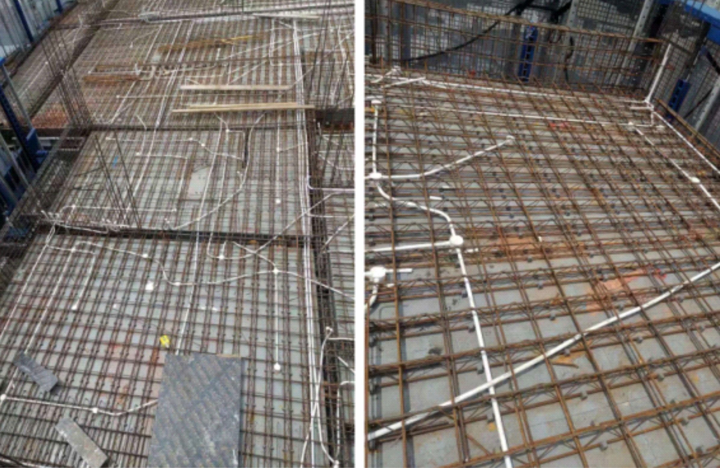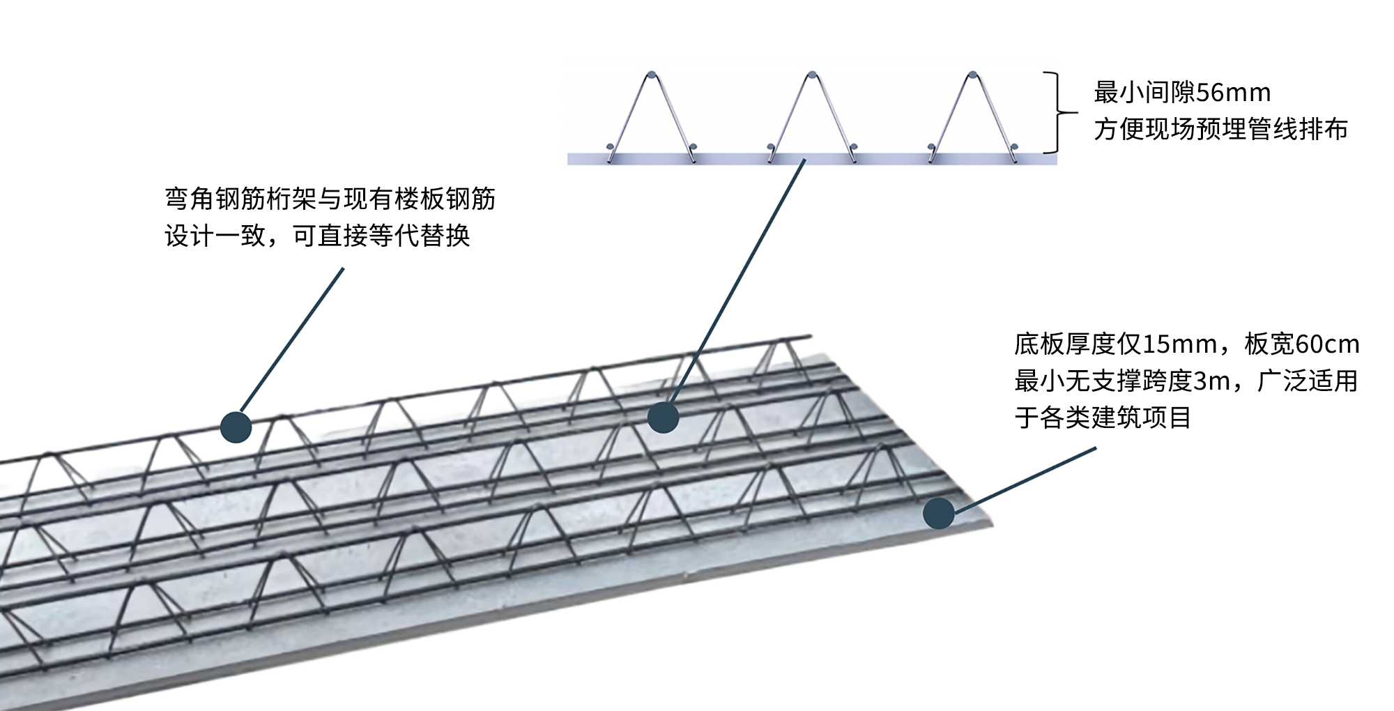 底板上部析架最小間隙55mm,增加了現場預埋管線的允許直徑,方便現場管線預埋并降低了預埋成本 |