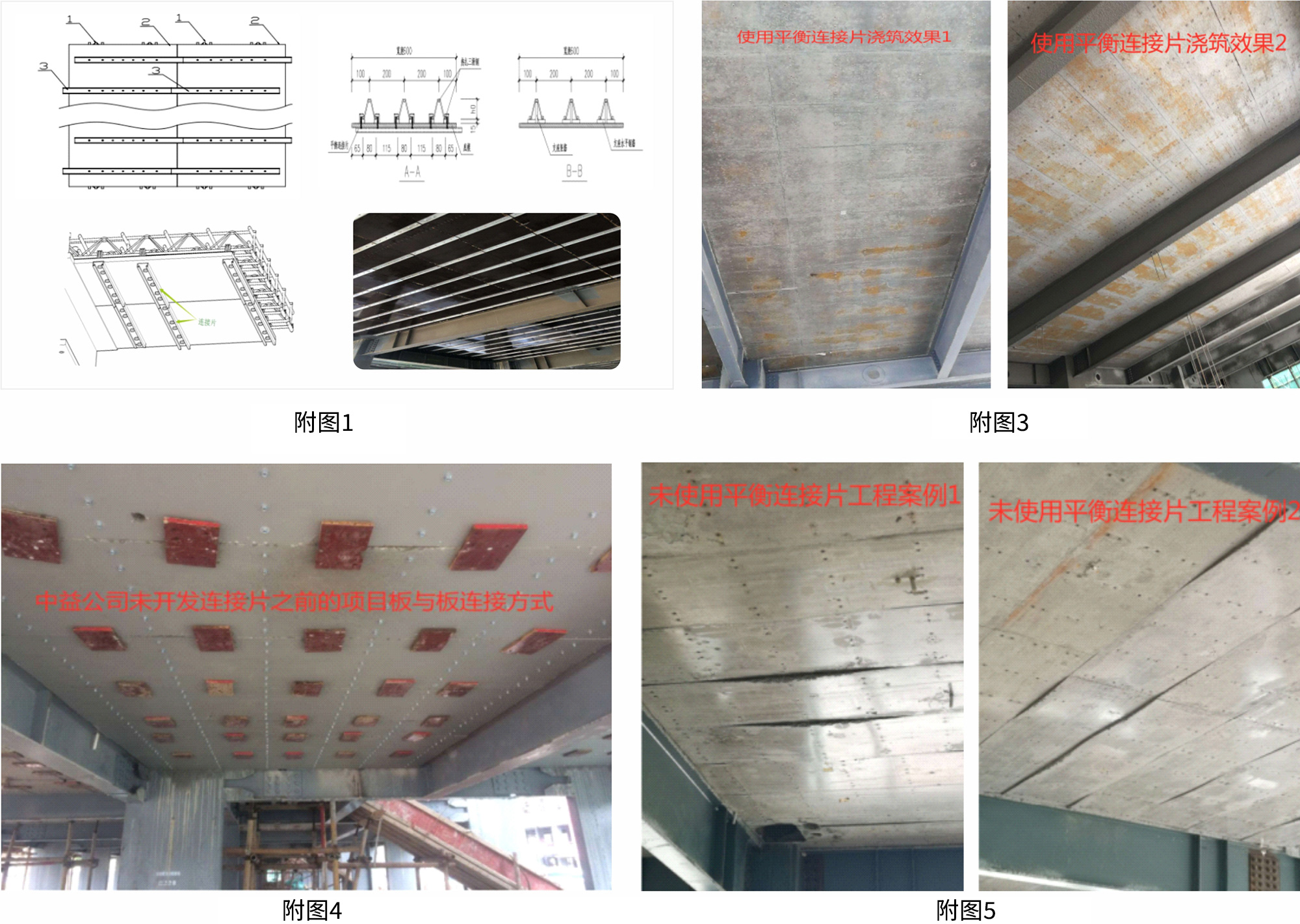 (3)從澆筑完后的效果對比:可拆式樓承板原來鋪裝完成后,在沒有連接片的時候采用的是下面用模板打 自攻螺絲,使板與板之間連接成一個整體平面(見附圖四),這樣的施工效 率低下,成本高, 澆筑后質量不能保證,這是某公司無連接片澆筑混凝土后 的效果見(附圖五),所以自從中益/泰博的裝配可拆式鋼筋桁架樓承板的底 部連接片技術開發以后(中益/泰博自主研發的專利技術),底部每 400mm間 距的有一檔平衡連接片(見附圖一)交叉錯位連接,防止了板與板之間的錯位 ,使得板面之間能成為一個平面,保證了樓板底部的平整度,并且提高了施 工速度,質量做到無需二次抹灰,可直 接移交裝修。(見附圖三)